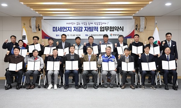 13일 경남도청 도정회의실에서 김명주 경제부지사와 기업·기관 관계자들이 미세먼지 저감 자발적 업무협약을 맺은 뒤 기념촬영을 하고 있다. (사진=경남도 제공)