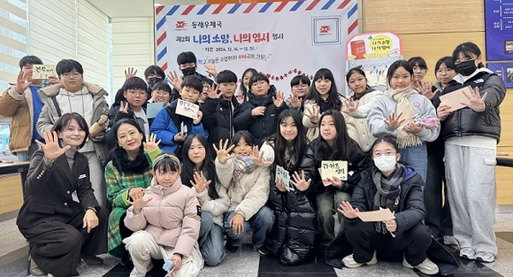 제2회 '나의 소망 나의 엽서' 이벤트에 참여한 학생들이 기념촬영을 하고 있다. (사진=부산우정청 제공)