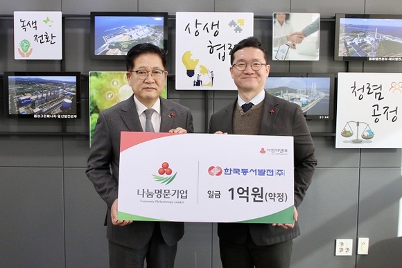 '나눔명문기업' 1호 가입을 기념해 권명호 동서발전 사장(왼쪽)과 양호영 울산사회복지공동모금회 사무처장이 기념촬영을 하고 있다. (사진=동서발전 제공)