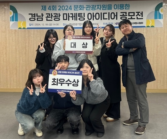 경성대학교는 글로컬문화학부 학생들이 지난 6일 경남 관광기업지원센터 대회의실에서 개최된 ‘제4회 2024 문화·관광자원을 이용한 경남 관광 마케팅 아이디어 공모전’에서 대상(국회의원상) 및 최우수상(국회의원상)을 받았다고 16일 밝혔다.