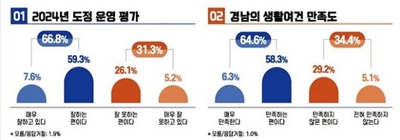 17일 경남도에 따르면 이번 조사는 도가 여론조사 전문기관 ㈜한국갤럽조사연구소에 의뢰, 올해 도민이 체감한 경남도정의 주요 성과와 2025년 도민이 바라는 주요 정책 분야를 조사해 도민의 의견을 도정 운영 방향에 반영하기 위해 진행됐다.