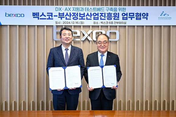 벡스코가 지난 16일 부산정보산업진흥원과 DX(디지털전환)·AX(인공지능 전환) 지원과 테스트베드 구축을 위한 '신규 사업 발굴 및 상호협력에 관한 업무협약'을 체결했다고 밝혔다.