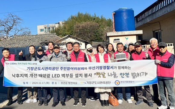 부산시 기장군도시관리공단이 지난 17일 공단 주민참여위원회와 기장경찰서와 협력해 ‘햇살 나눔, 안전 밝히기’ 사회공헌 프로젝트를 성공적으로 추진했다고 밝혔다. 이번 프로젝트는 낙후된 지역의 야간 생활환경을 개선하고, 범죄 예방을 통해 안전 사각지대를 해소하기 위해 기획됐다.