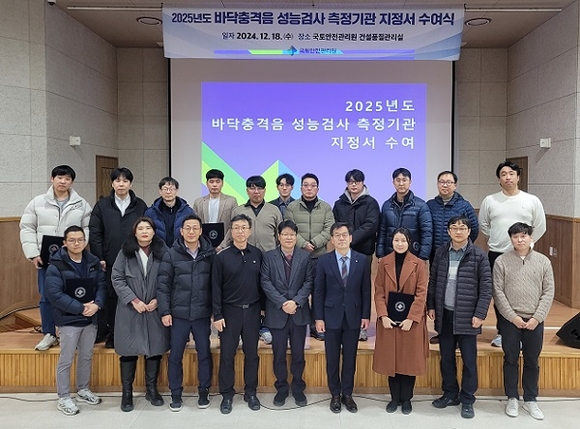 국토안전관리원은 18일 경남 진주에 있는 본사 대강당에서 바닥충격음 성능검사 측정기관 지정서 수여식을 개최했다고 밝혔다.