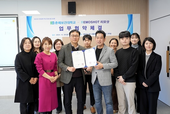 춘해보건대학교가 20일 해악관 다목적시뮬레이션 센터 내 UTCC(Ulsan Total Care Center) VR실에서 (주)리모샷과 업무협약 체결 및 가상현실(VR)을 활용한 노인재활·간호 시뮬레이션 체험 행사를 개최했다.