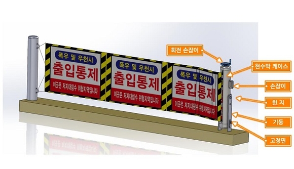 김해시 공무원이 개발한 하천출입차단시설은 개소당 설치 비용이 200만원 정도에 불과해 경제적이며 시인성도 좋아 차단 효과가 뛰어나다. 또 혼자서도 신속한 설치가 가능하고 비상 상황 종료 시 현수막은 신속하게 감아 기둥 내 자체 보관이 가능해 편리성까지 두루 갖췄다.