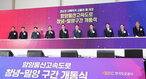 경남도는 27일 오후 2시 밀양휴게소(울산방향)에서 박완수 경남도지사, 백원국 국토교통부 제2차관, 함진규 한국도로공사 사장, 박상웅 국회의원, 박인 경남도의회 부의장, 안병구 밀양시장, 성낙인 창녕군수 등이 참석한 가운데 '함양~울산고속도로 창녕~밀양 구간' 개통식을 가졌다고 밝혔다.