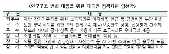 최우수상에는 ‘지방 장기거주자를 위한 보금자리론 이자비용 환급’을 내용으로 하는 지방소멸 대응 아이디어가, 우수상에는 ‘노인부양 가족을 위한 전세보증 우대’와 ‘부모·자녀의 공사 상품 동시 이용에 따른 우대금리 제공’을 내용으로 하는 초고령사회 대응 아이디어 등이 선정됐다.