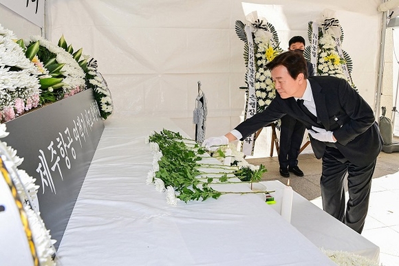이날 오전 굳은 표정으로 합동분향소를 찾은 조규일 시장은 “안타깝게 돌아가신 179분 희생자의 명복을 빈다”며 애도의 마음을 담아 국화 한 송이를 헌화하고 조의를 표했다.