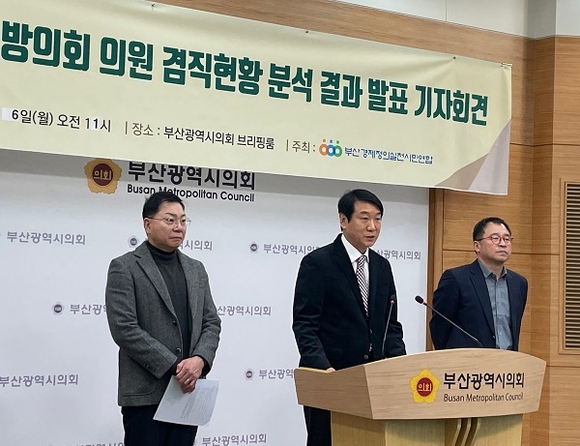 부산경제정의실천시민연합(부산경실련)은 6일 오전 부산시의회 브리핑룸에서 기자회견을 열고 제9대 부산지방의회 의원들의 겸직 현황 분석 결과를 발표했다. 부산시의원 46명과 기초의회 의원 182명을 대상으로 한 이번 조사는 각 의회 홈페이지에 공개된 겸직 신고 자료를 토대로 진행됐다.