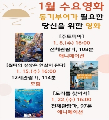 1월은 ‘동기부여가 필요한 당신을 위한 영화’라는 주제로 1월 29일 설날 연휴를 제외한 매주 수요일 오후 4시, 1층 종합영상실에서 총 3회 상영한다.