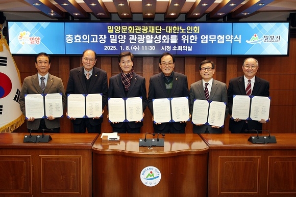 밀양문화관광재단은 8일 밀양시청 소회의실에서 대한노인회 경남연합회(마산, 창원, 진해, 의령, 함안, 밀양) 6개 지회와 밀양지역 관광 활성화를 위한 업무협약을 체결했다.