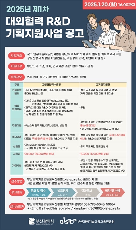 부산과학기술고등교육진흥원(BISTEP)이 2025년 제1차 대외협력 R&D기획지원사업 신규 과제 공고'를 오는 20일까지 접수한다고 밝혔다.