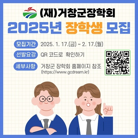 접수 기간은 오는 17일부터 2월 17일까지며, 공고일 현재 부모 모두 거창군에 주소를 두고 거주하는 경우를 원칙으로 한다. 자체 심의를 거쳐 4월 18일에 최종 선발된 장학생을 발표할 예정이며, 장학생으로 선발되는 경우 각 학제 안에서 1회에 한해 지원받을 수 있다.