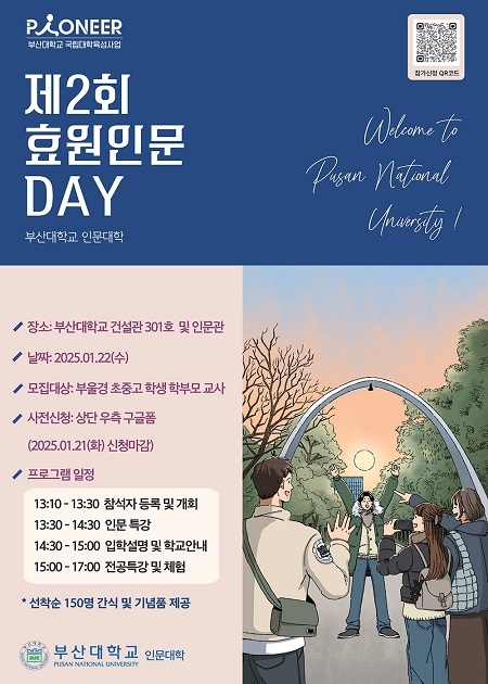 부산대학교 인문대학은 오는 22일 오후 1시부터 5시까지 교내 성학관과 인문관에서 초·중·고 학생 및 학부모를 대상으로 '제2회 효원 인문 DAY'를 개최한다고 14일 밝혔다.