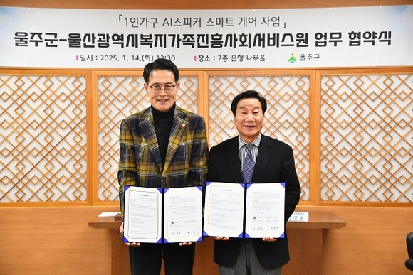 울주군은 14일 군청 은행나무홀에서 울산시복지가족진흥사회서비스원과 독거어르신 고독사 예방을 위한 ‘1인 가구 AI스피커 스마트케어 사업’ 협약을 체결했다.