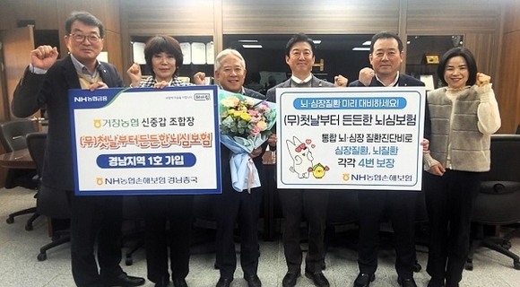 NH농협손해보험 경남총국은 15일 거창농협 본점에서 신중갑 조합장의 NH농협손해보험 신상품 ‘무배당 첫날부터 든든한 뇌심보험’ 경남지역 1호 가입 축하 행사를 가졌다.