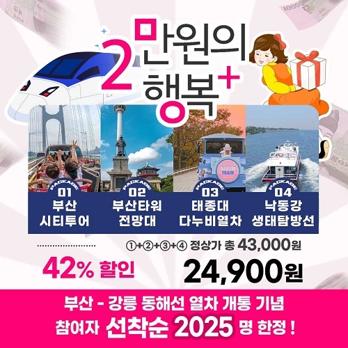부산관광공사가 부산과 강릉을 잇는 동해선 ITX-마음 개통을 기념해 특별 할인 프로모션 ‘이만원의 행복 플러스’ 상품을 선착순 한정 판매한다고 15일 밝혔다.