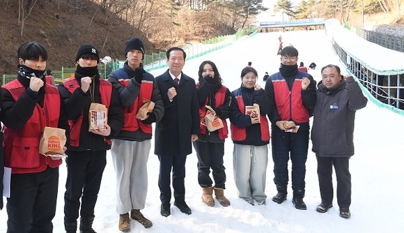 구인모 거창군수가 15일 수승대 눈썰매장을 방문해 무빙워크 등 시설을 점검하고 지속되는 한파 속에서도 야외에서 근무하는 안전요원과 관계부서 직원을 격려하며 애로사항을 청취했다.