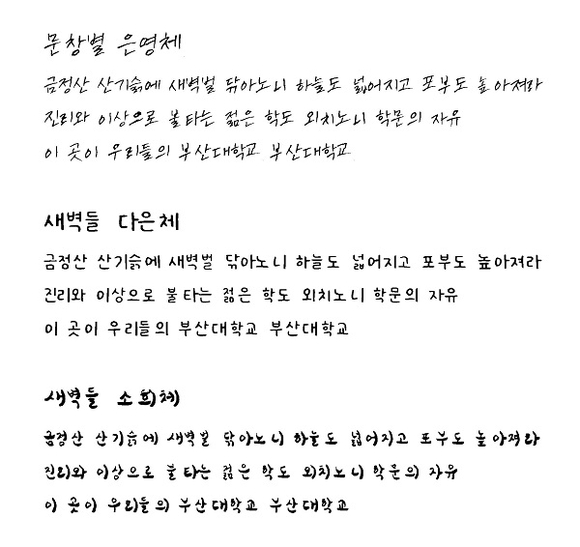 부산대학교 출판문화원은 지난해 11월 한글 사랑과 대학 구성원 간 소통을 위해 '제1회 PNU 손글씨 대회'를 개최하고, 최근 수상작 3종을 서체로 개발해 무료 배포한다고 16일 밝혔다.