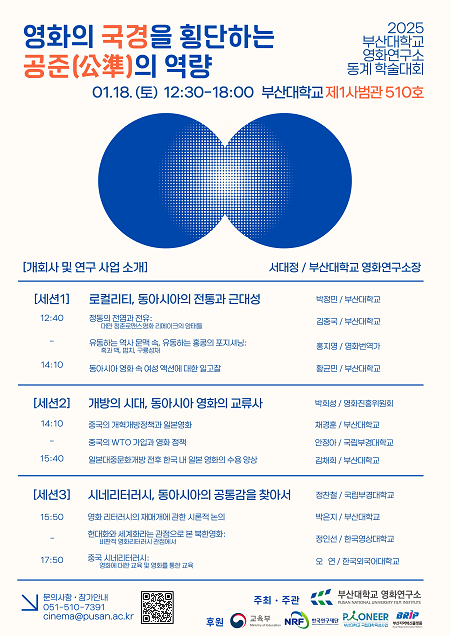 부산대학교 영화연구소는 ‘영화의 국경을 횡단하는 공준(公準)의 역량’을 주제로, '2025년 부산대 영화연구소 동계 학술대회'를 오는 18일 낮 12시 30분 교내 제1사범관 510호에서 개최한다고 16일 밝혔다.
