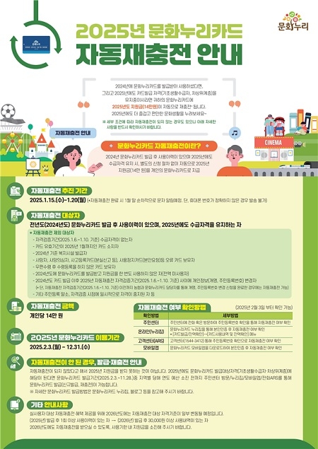 전년도 사용 이력이 있으며, 2025년에도 문화누리카드 발급 자격을 유지하고 있다면 별도의 절차 없이 15일부터 20일까지 소지한 카드에 지원금이 자동 재충전된다. 다만, 2024년도에 카드 사용 이력이 없거나 카드 유효기간이 2025년도 1월까지라면 자동 재충전 대상에서 제외된다.