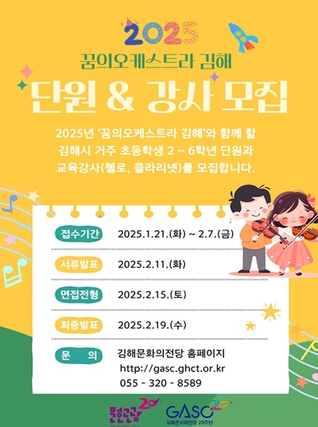 김해문화관광재단과 김해시가 2019년부터 진행하고 있는 ‘꿈의오케스트라 김해’가 오는 21일부터 내달 7일까지 2025년 신규 오케스트라 단원 및 교육강사(첼로, 클라리넷)를 모집한다고 20일 밝혔다.