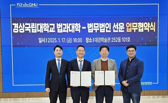 경상국립대학교 법과대학은 지난17일 오후 법과대학 대경학술관 모의법정실에서 법무법인 선운과 법학 전공자의 진로 탐색 및 경남지역 법률서비스 향상을 위한 업무협약을 체결했다고 20일 밝혔다.