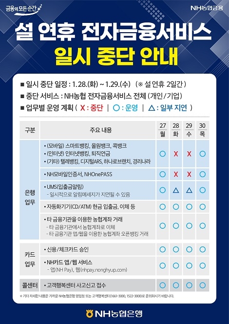 NH농협은행 경남본부는 디지털 금융시스템 개편 작업에 따라 설 연휴 중인 오는 28일부터 29일까지 전자금융서비스를 일시 중단한다고 21일 밝혔다.