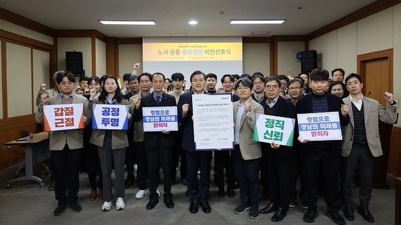 경남개발공사는 공사 본사 3층 상황실에서 전 임직원이 참여하는 가운데 윤리경영 비전 선포식을 개최했다고 21일 밝혔다. 이번 선포식에서는 "청렴으로 경남의 미래를 밝히자!"라는 비전이 발표됐으며, 전 임직원은 투명하고 청렴한 지역사회를 이끌어가겠다는 의지를 다졌다.