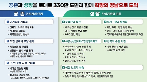 도는 이와 연계해 공존과 성장을 토대로 330만 도민과 희망의 경남으로 도약한다는 2025년 도정 슬로건에 따라 △공존(민생경제 안정)과 △성장(산업경쟁력 강화)에 중점을 두고 대응전략을 수립했다.