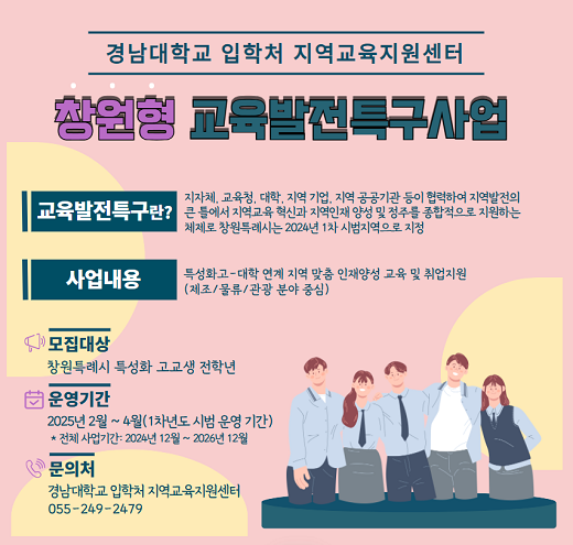 ‘창원형 교육발전특구사업’은 인구와 산업의 수도권 집중으로 심화되고 있는 가운데 지방소멸 위기를 극복하고자 ‘청년인구 교육-기업 맞춤형 인재 양성-정주’까지 원스톱으로 지원한다. 창원특례시는 지난해 교육부에서 선정하는 교육발전특구 1차 시범지역으로 선정된 바 있으며, 사업 기간은 2026년 12월까지다.