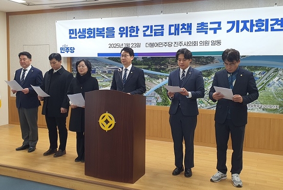 민주당 진주시의원들은 23일 오후 시청 브리핑룸에서 기자회견을 갖고 심각한 내수 위축 극복을 위해 예산 편성과 정책 마련 등을 위해 시에 적극 협력하겠다고 밝혔다.