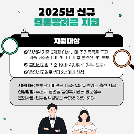 이 사업은 신혼부부의 경제적 부담을 덜어주고 저출산·인구 소멸 위기에 대응하고자 시에서 올해 신규로 시행하는 사업이다. 지원 대상은 2025년 1월 이후 혼인신고자로 6개월 이상 밀양에 주소를 둔 19세에서 49세의 신혼부부다.