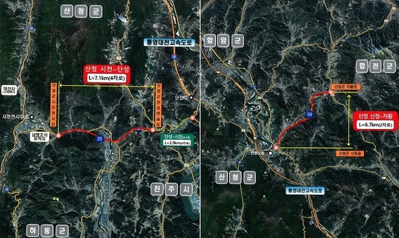31일 산청군에 따르면 '국도 20호선 단성~시천 간 4차로 확장'과 '국도59호선 산청~차황 간 굴곡도로 선형개량' 사업이 국토교통부 제6차 국도·국지도 5개년 도로건설계획(2026~2030년)의 일괄 예비타당성 조사대상 사업으로 선정됐다.