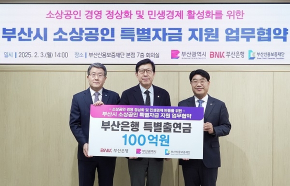 부산은행은 3일 부산시, 부산신용보증재단과 ‘소상공인 특별자금 지원 업무협약’을 체결했다고 밝혔다. 협약식에는 방성빈 부산은행장, 박형준 부산시장, 성동화 부산신용보증재단 이사장이 참석했다.
