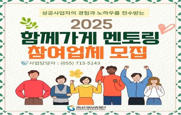 경남신용보증재단이 사업에 어려움을 겪고 있는 예비창업자 및 소상공인들을 성공사업주와 함께 고민하고 해결책을 찾아 실패리스크를 줄이고 안정적인 창업 또는 사업 운영이 될 수 있도록 자체사업인 '2025년 함께가게 멘토링' 사업을 3일부터 시행한다.