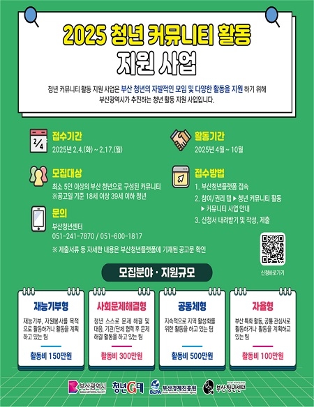 올해 총 50개 청년 커뮤니티 팀을 선발하며, 만 18세 이상 39세 이하 부산 청년 5인 이상으로 구성된 팀이라면 누구나 신청할 수 있다. 선정된 팀은 ▲재능기부형 ▲공동체형 ▲사회문제 해결형 ▲자율형 등 4가지 활동 유형에 따라 100만 원에서 최대 500만 원까지 활동비를 지원받는다.