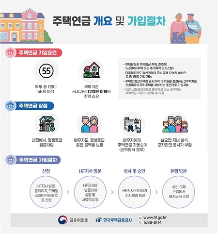 주택연금 가입을 고려하고 있는 분들은 공사 콜센터로 문의해 월지급금 등 상품에 대한 자세한 상담을 받을 수 있으며, 가입은 가까운 지사를 방문해 신청할 수 있다.