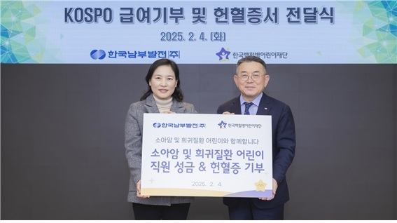 한국남부발전이 지난 4일 투병생활로 어려움을 겪고 있는 소아암·희귀병 아동들을 돕기 위해 직원 성금과 헌혈증을 한국백혈병어린이재단에 기부했다고 밝혔다.
