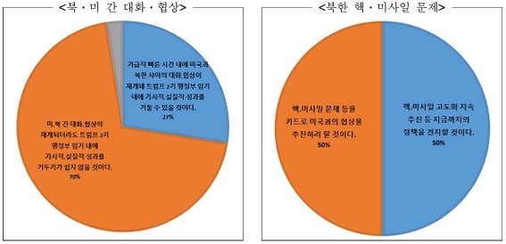 설문의 관심 쟁점 중 하나가 북한의 핵·미사일이 이슈였는데, 고도화 지속과 대미 협상 추진에 따른 해결 노력 의견이 정확히 절반으로 나뉘었다.