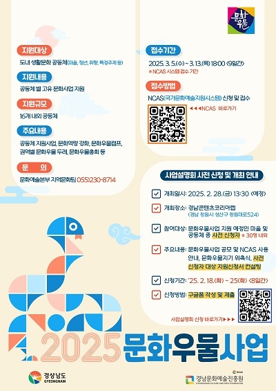 오는 7일부터 내달 13일까지 35일간 공고 및 내달 5일부터 13일까지 국가문화예술지원시스템(NCAS)을 통해 접수 가능하며, 지역문화팀으로 문의하면 된다.