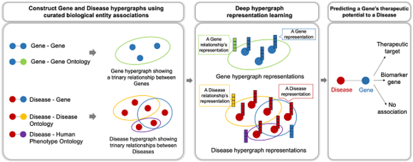 질병은 개인이 가진 여러 유전적 요소들의 복합적 상호작용으로 발생한다. 연구팀은 이 같은 상호작용을 반영해 어떤 유전자의 치료적 유전자 또는 생체 지표 유전자로서의 가능성을 예측하는 AI 시스템을 제안했다. 이 시스템은 하이퍼그래프(Hypergraph) 및 어텐션(Attention) 메커니즘을 사용해 질병에 관여하는 여러 생물학적 요소들 사이 복합적 상호작용을 모델링하고, 어텐션 연산 결과 시각화를 통해 모델 예측 결과에 대한 설명도 제공한다.