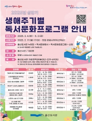울산도서관은 3월 4일부터 5월 2일까지 ‘2025년 상반기 생애주기별 독서문화프로그램’을 운영한다고 14일 밝혔다.