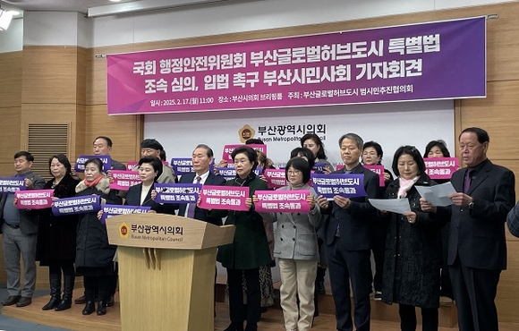 부산글로벌허브도시 범시민추진협의회가 17일 부산시의회 브리핑룸에서 기자회견을 열고, ‘부산 글로벌허브도시 특별법’의 조속한 국회 처리를 강력히 촉구했다.