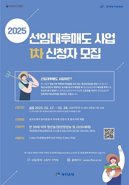 '선임대후매도사업'은 청년 농업인이 희망하는 농지를 공사가 매입한 후, 청년 농업인에게 매도를 목적으로 조건부 장기 임차(최장 30년)하고 원리금 상환이 마무리되면 소유권을 이전해 청년 농업인의 안정적인 영농 정착을 지원하는 사업이다.