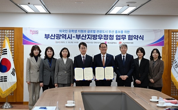 부산지방우정청과 부산시는 18일 오후 부산시청 국제의전실에서 '외국인 유학생 지원' 및 '글로벌 관광도시 부산 홍보'를 위한 업무협약을 체결했다.