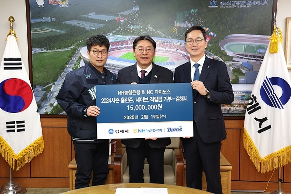 경남 김해시는 19일 NH농협은행 경남본부와 ㈜NC다이노스가 2024시즌 홈런존 운영 및 세이브 실적에 따른 적립 기금 1500만원을 전달했다고 밝혔다.