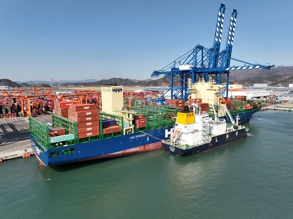 이번 벙커링·하역 동시작업은 신항 7부두(DGT)에서 진행됐다. 한국엘엔지벙커링(주) 블루웨일(Blue Whale)호가 하역작업 중인 HMM SKY(7700TEU급)에 약 2400톤의 LNG를 성공적으로 공급했다.