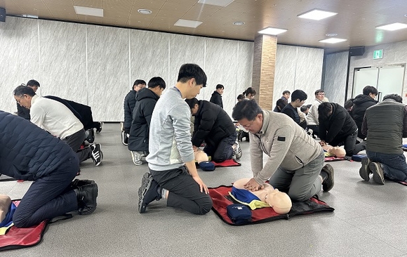 이번 교육은 법정의무교육 대상자 및 자동심장충격기(AED) 관리자뿐만 아니라 응급처치에 관심 있는 임직원 40여명이 참여했으며, 전문 응급처치 교육기관의 강사를 초빙해 실습 중심으로 진행됐다.